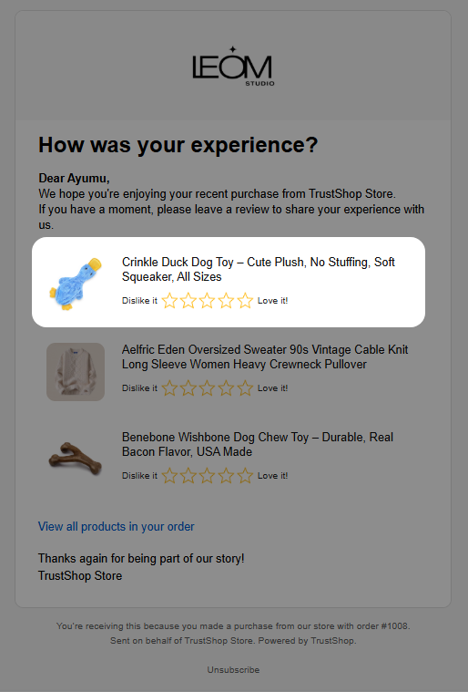 When customers open the email, they can immediately write and submit a review. By removing extra steps in the review process, In-email Forms make it easier for customers to leave reviews, resulting in higher submission rates and faster review collection.